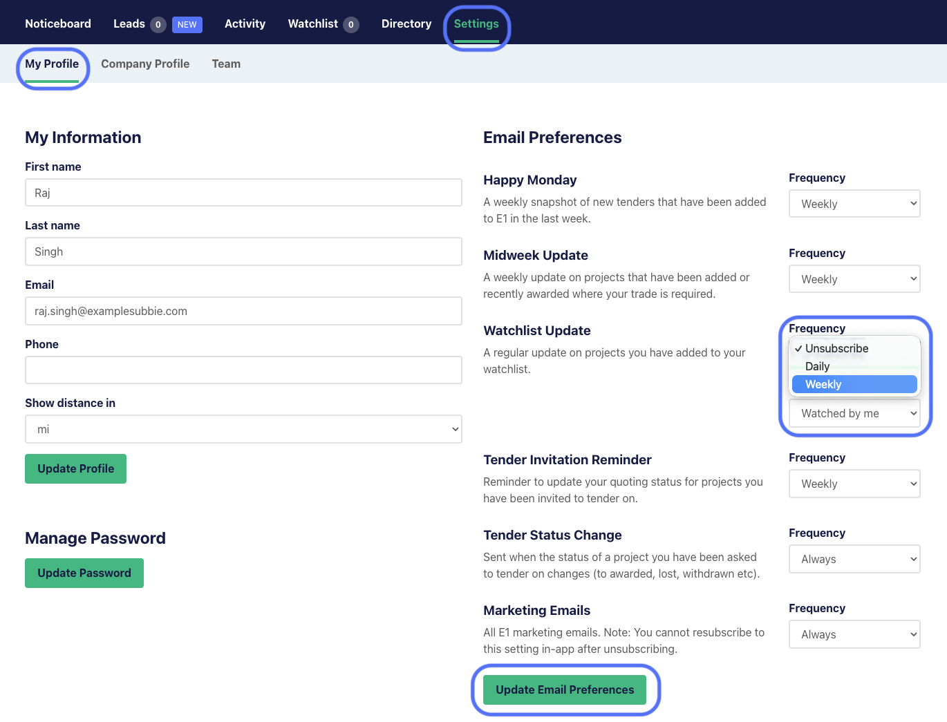 We highly recommend leaving this email active. We suggest refining the frequency (daily or weekly) and selecting updates on only ‘projects watched by you’, or you can set it to ‘watched by anyone’ to get updates on projects added to the Watchlist by any member of your team. You’ll be notified of changes to tender dates, when the project is awarded, and any addendums to the documentation. This email is sent daily, or weekly on Wednesdays.