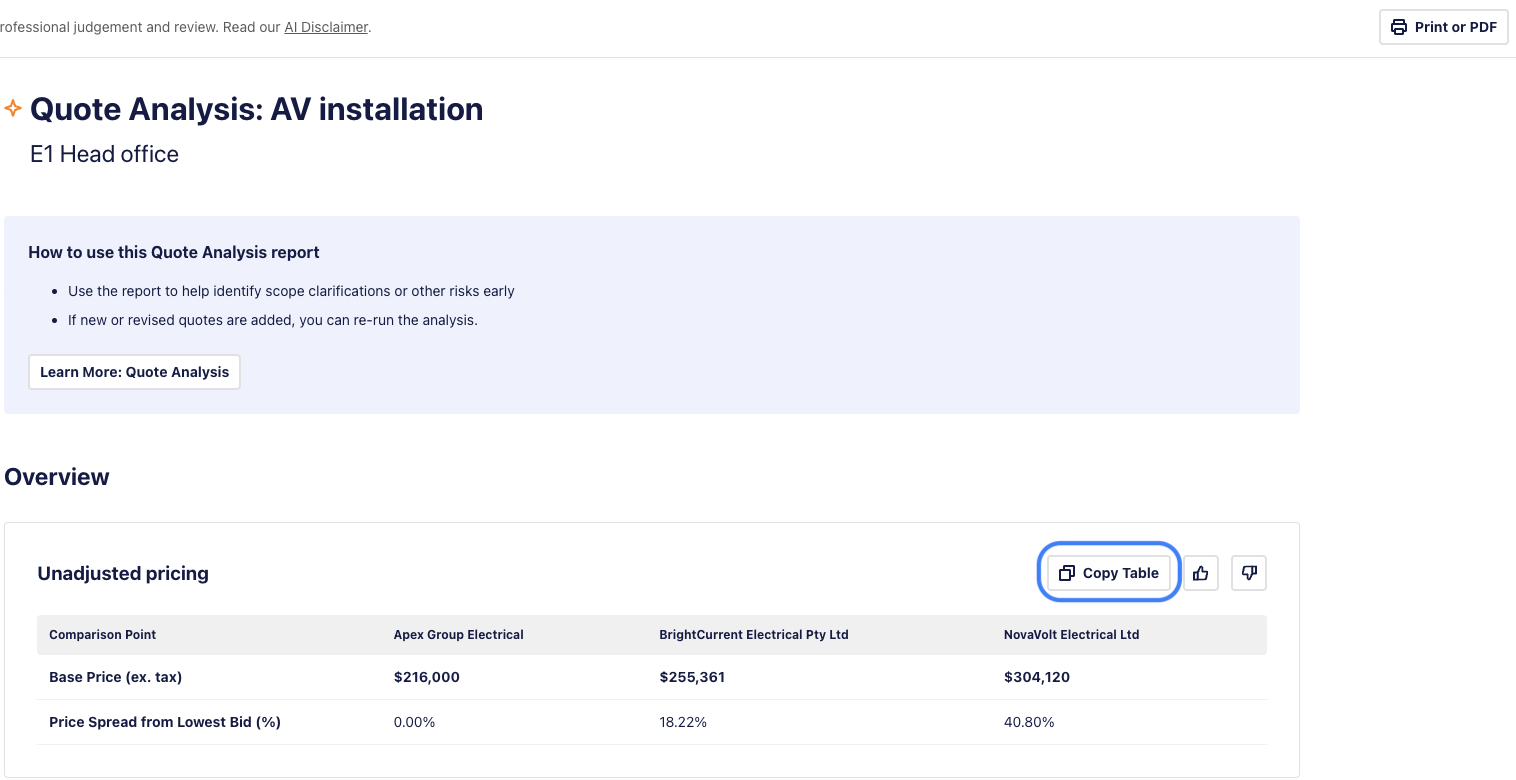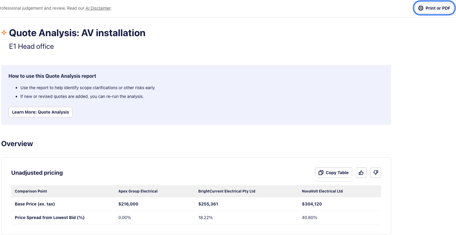 - Exporting: You can export the quote analysis via the ‘Print or PDF’ button at the top right of the report.